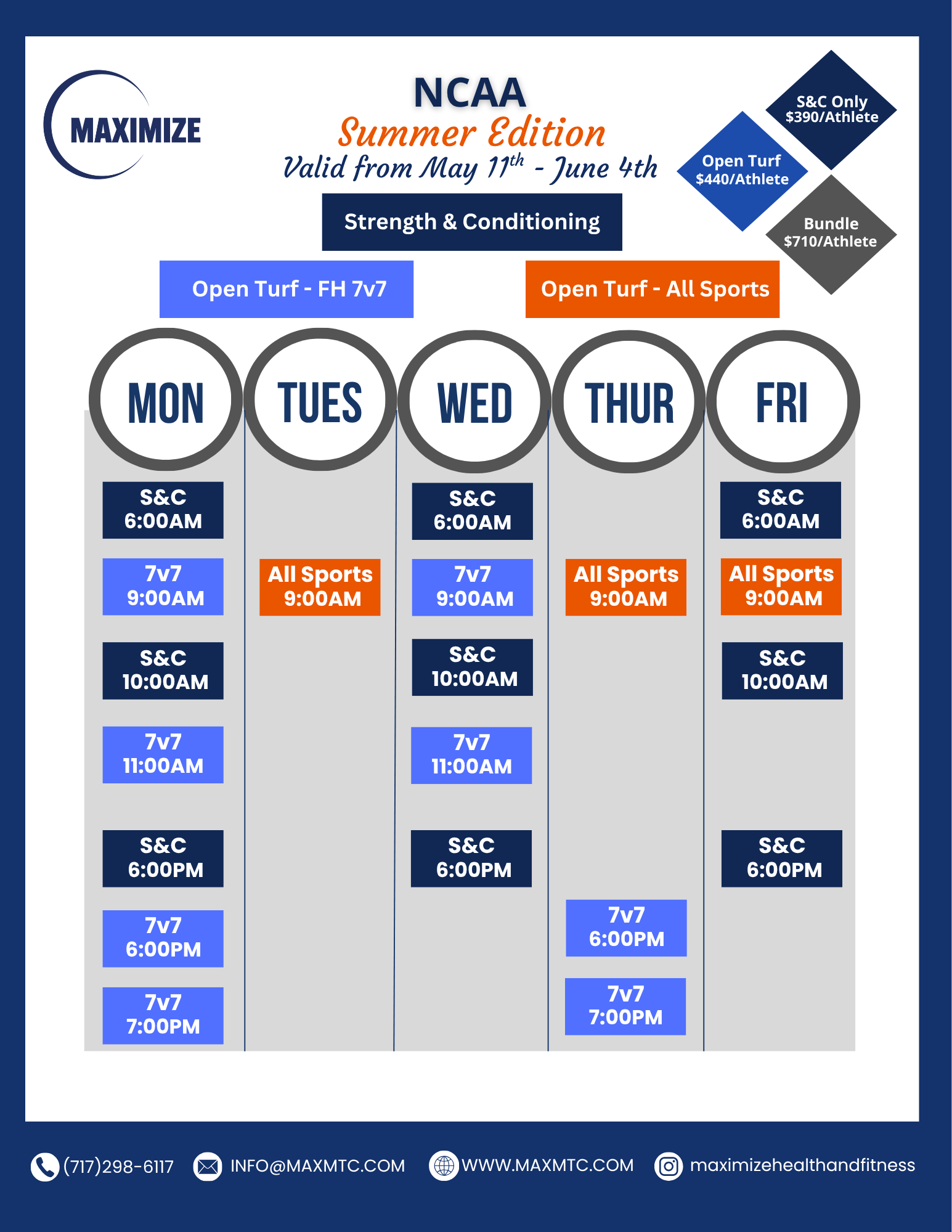Click the NCAA SCHEDULE button for a pdf of the S&C and Open Turf times on one page.